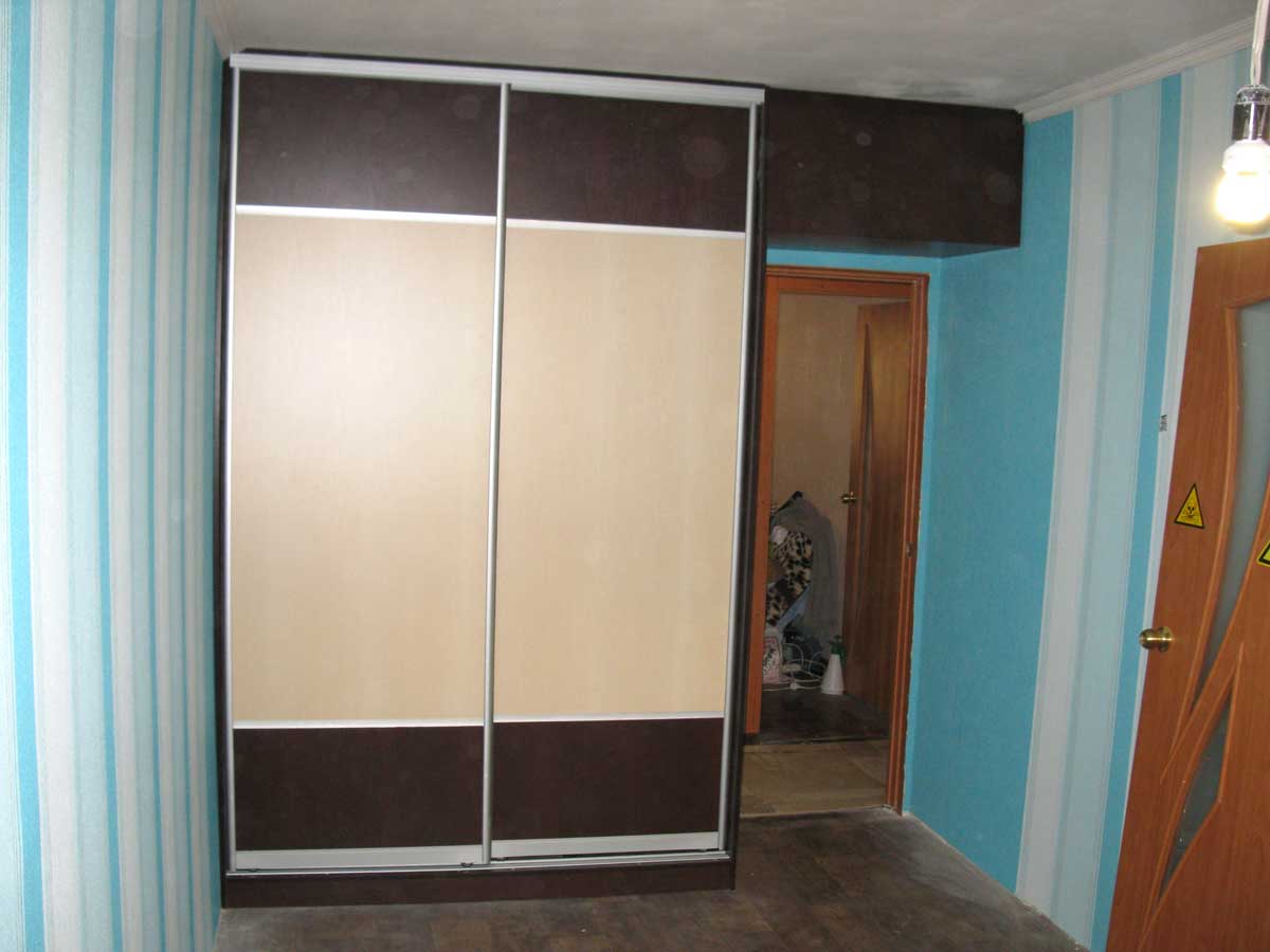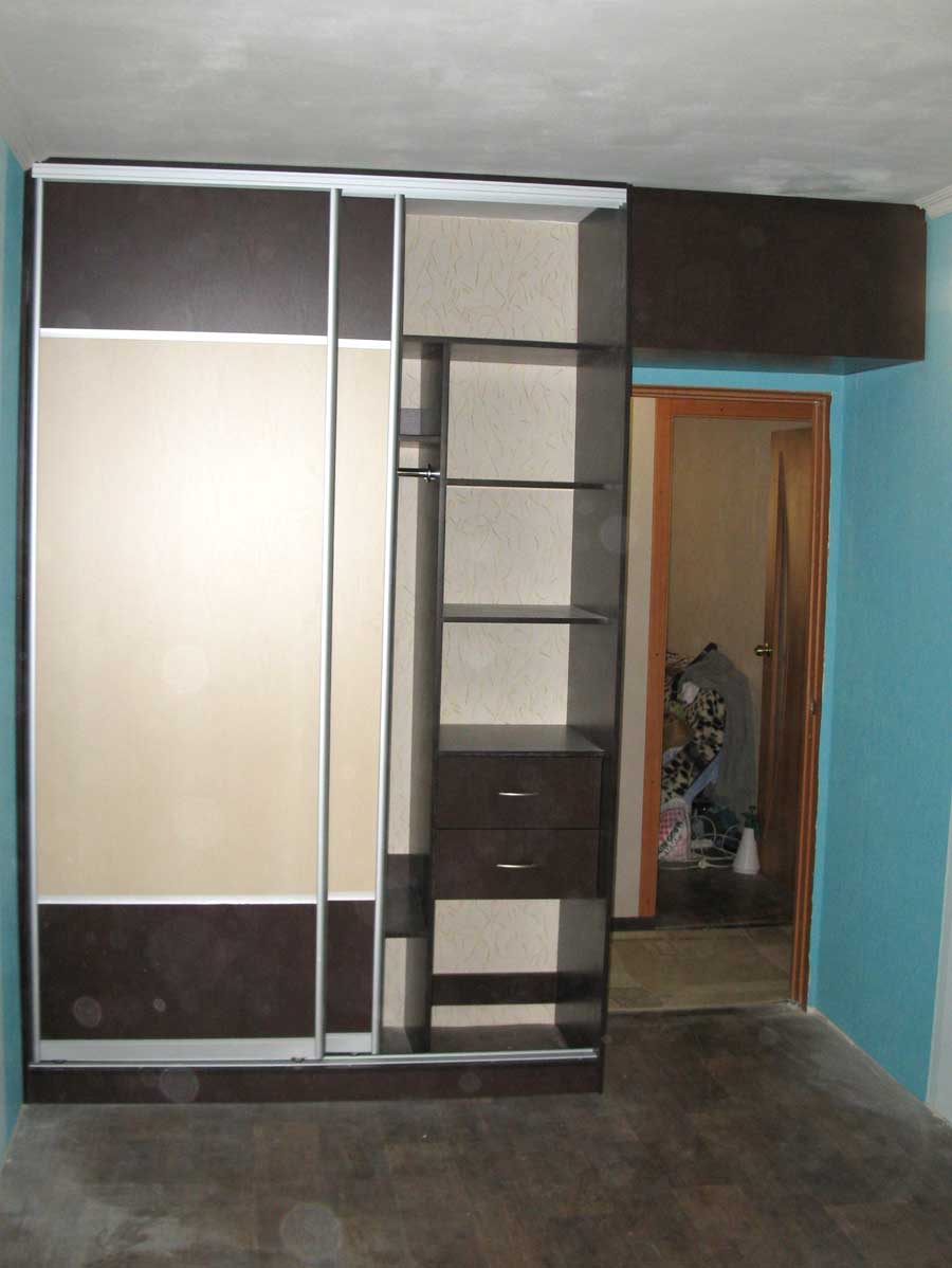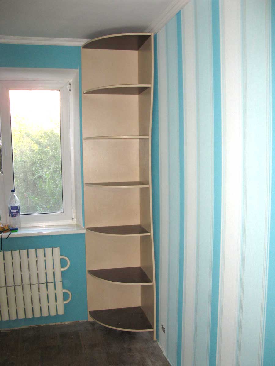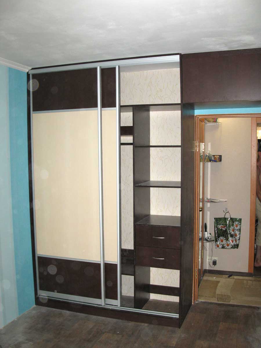 Длина - 1,5 м. Глубина - 50см, Высота — 2,6м, длина антресоли - 0,8 м ДСП — венге темный, 16мм Двери — ADS, ДСП 10мм. Антресоль. Радиусный эркер. Тумбочка на стенку.