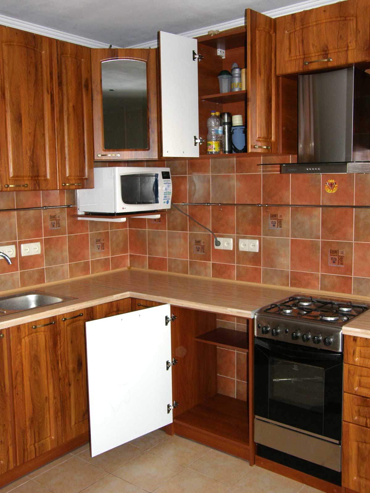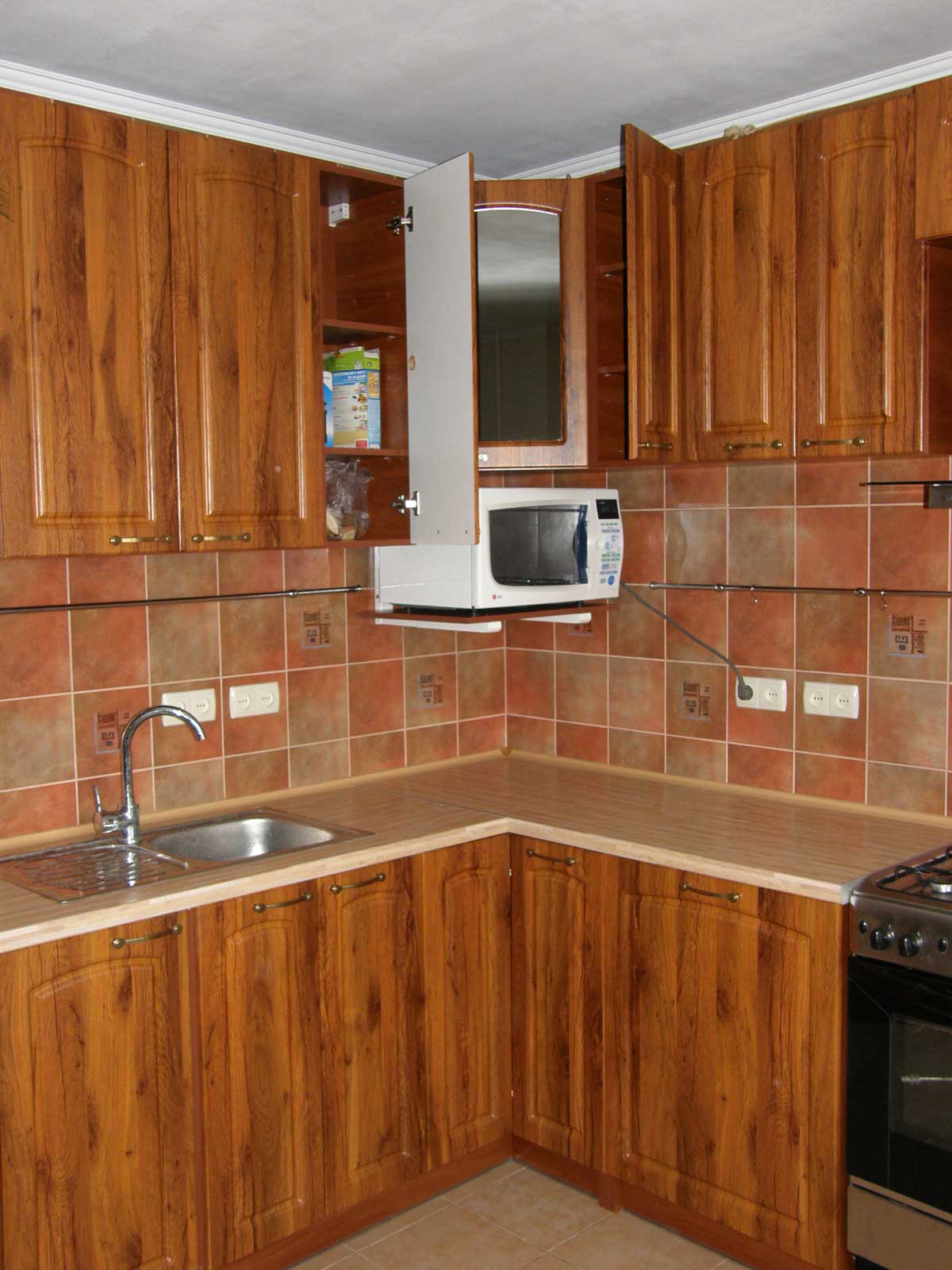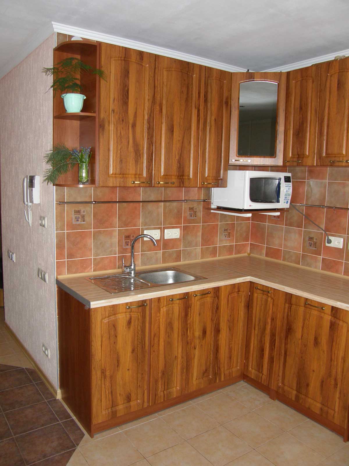 Кухня Г - образная, расположена в 10-этажном доме улучшенной планировки. Размер по первой стене - 2,3 м, по второй - 2,9 м.