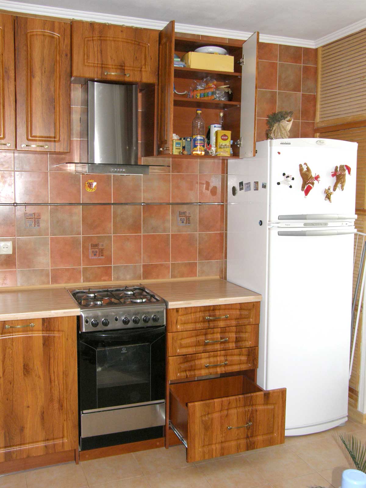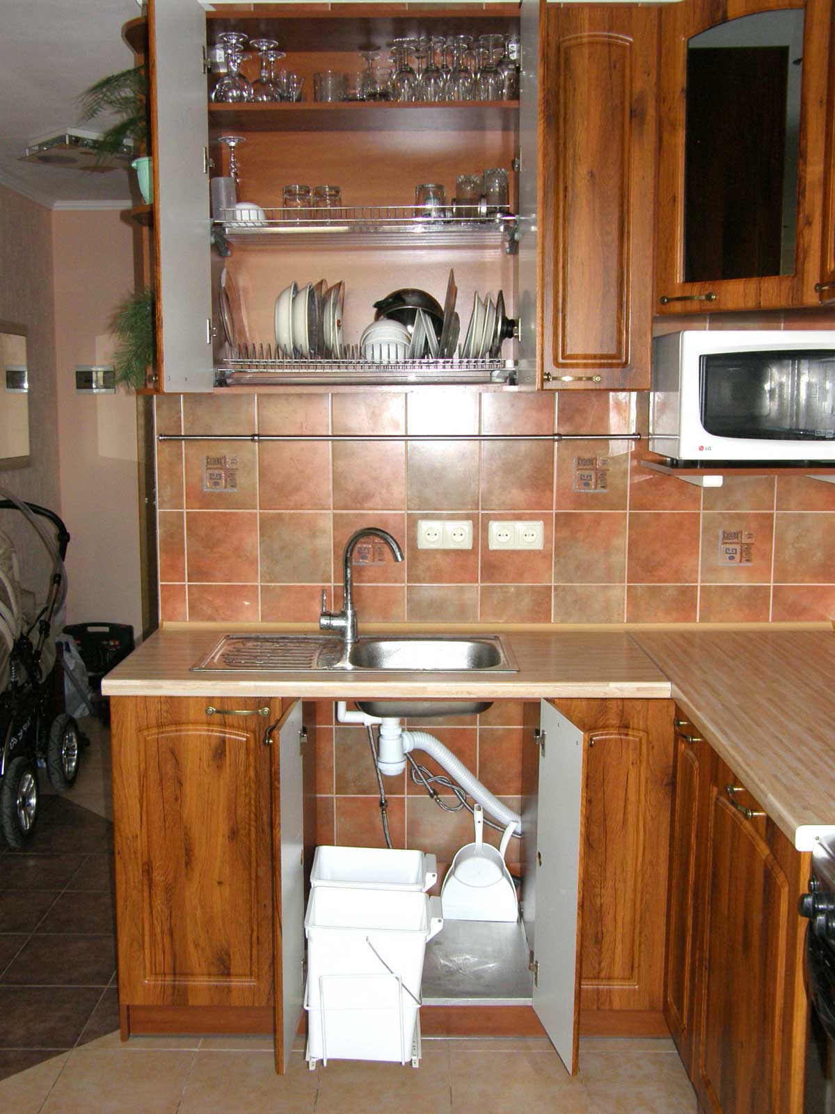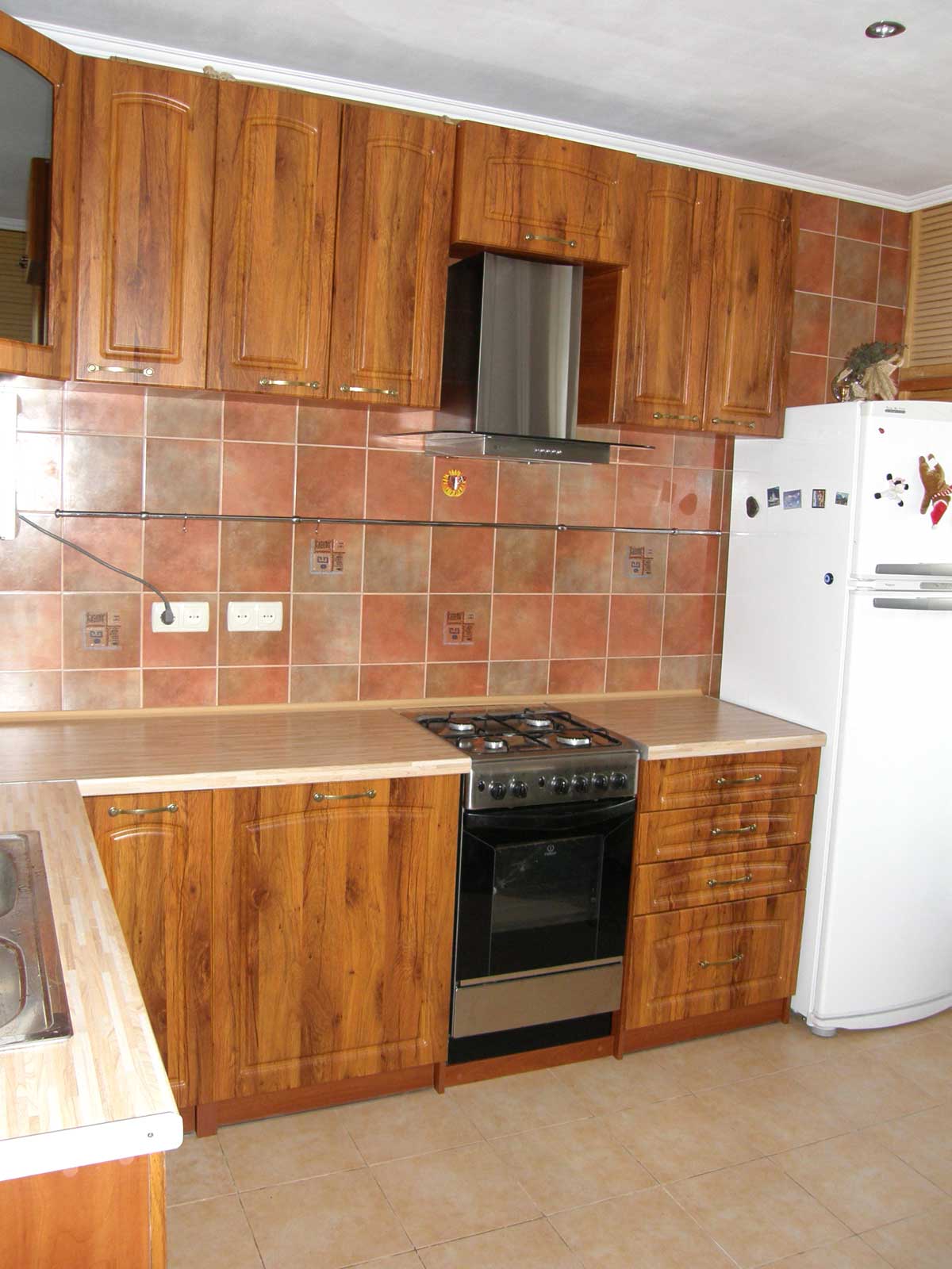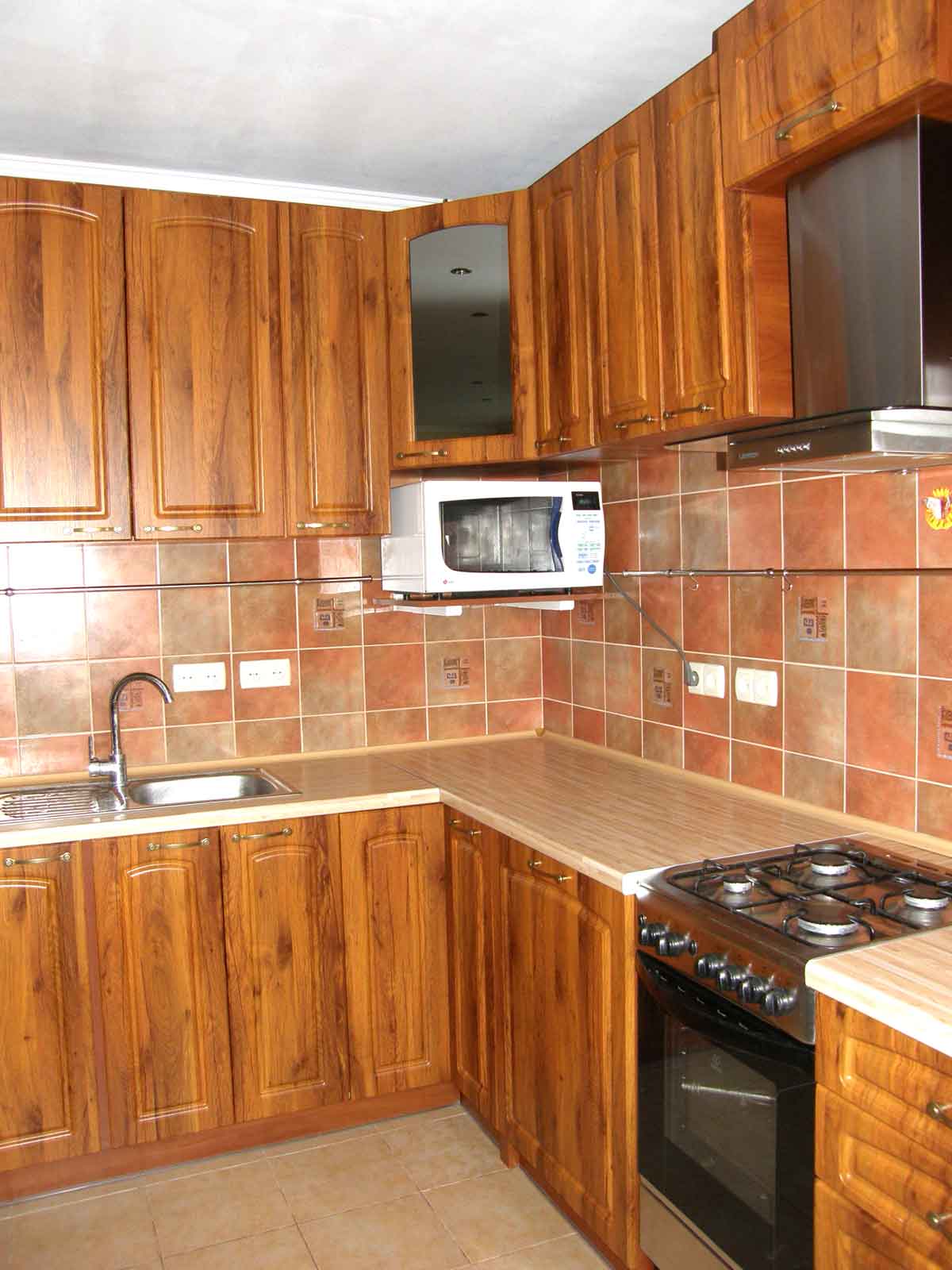 Кухня Г - образная, расположена в 10-этажном доме улучшенной планировки. Размер по первой стене - 2,3 м, по второй - 2,9 м.