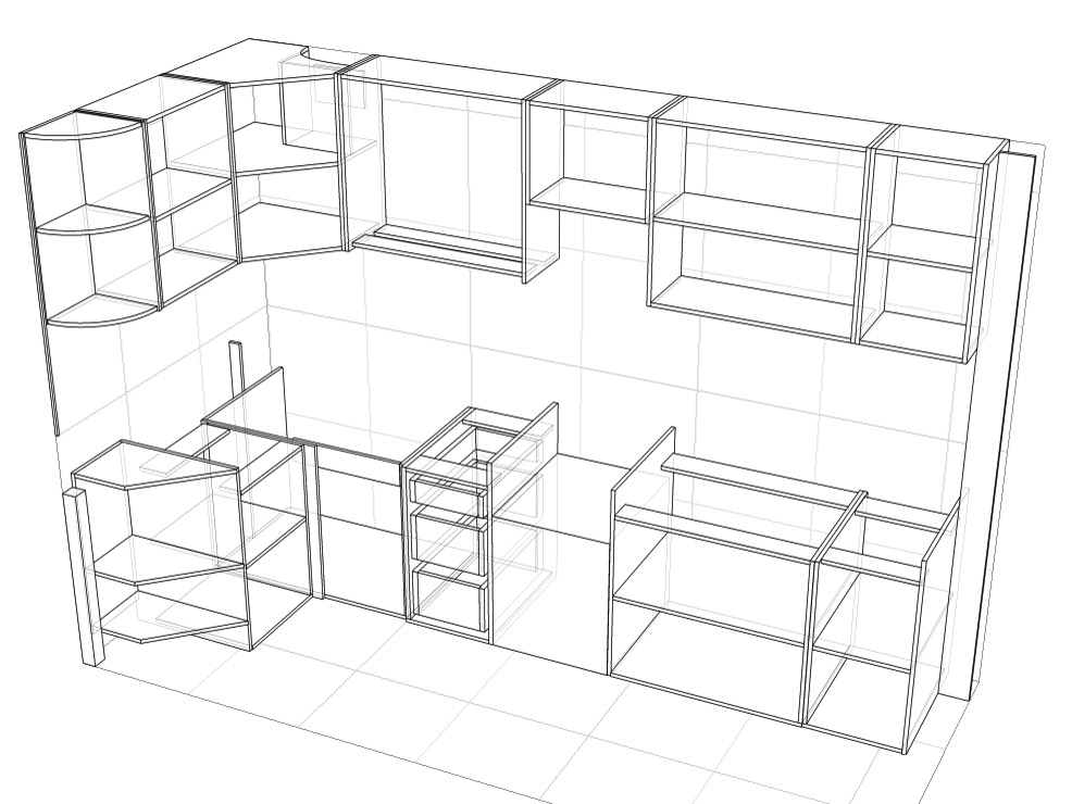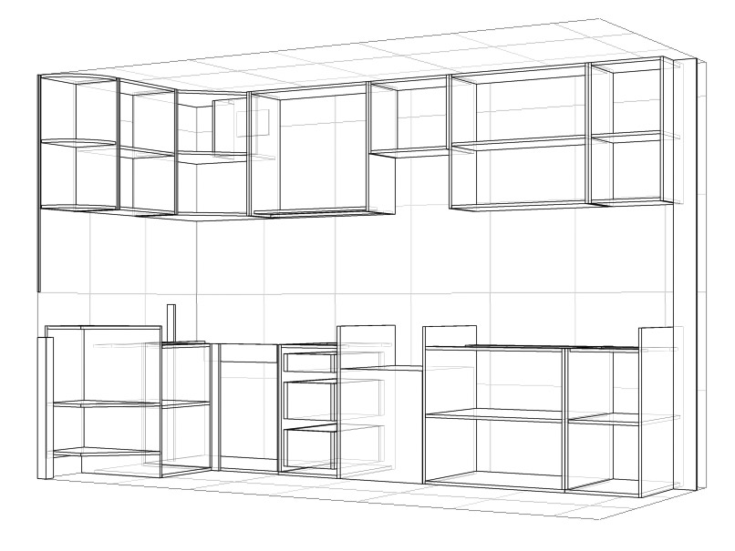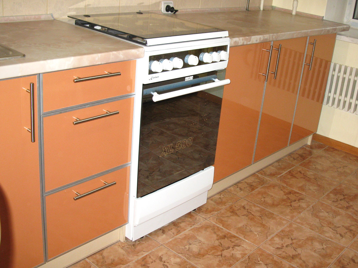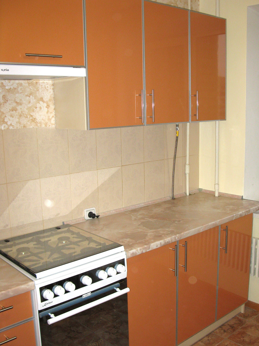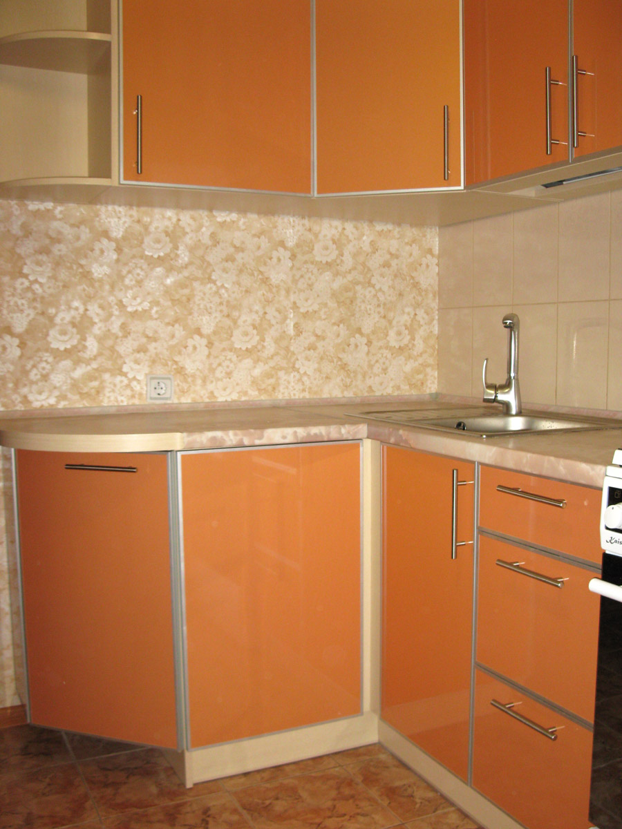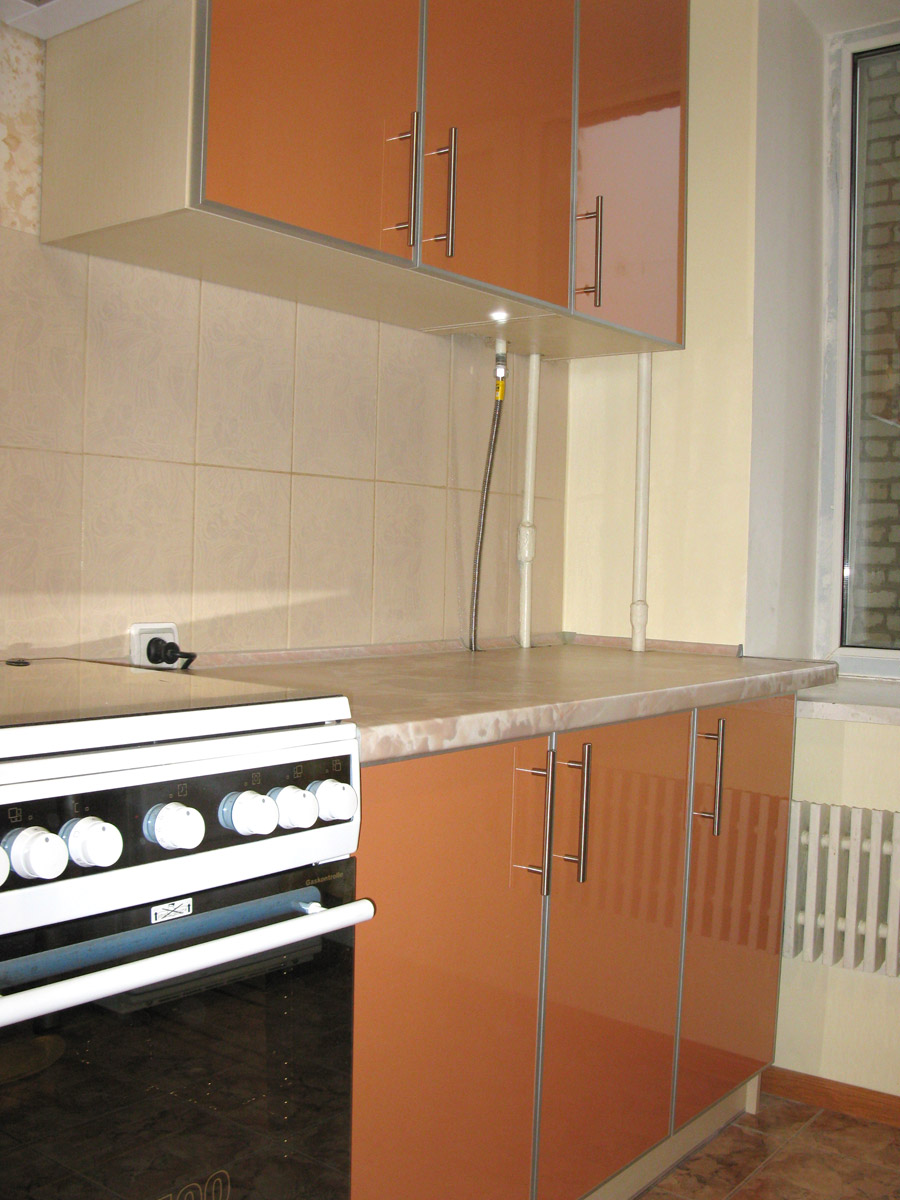 Кухня угловая, расположена в 9-этажном доме. Размер по 1й стене - 3,22 м,, по 2й стене - 1,43 м,