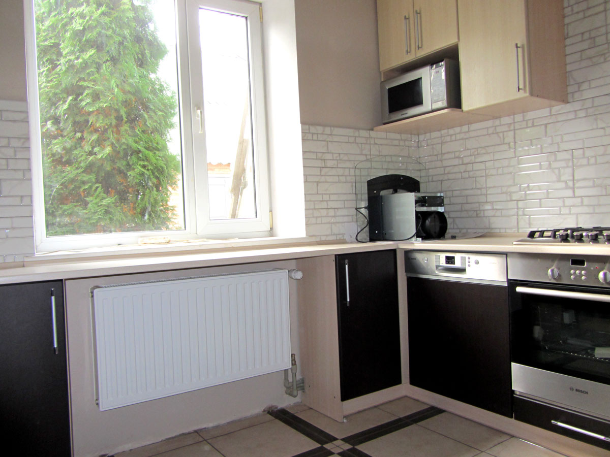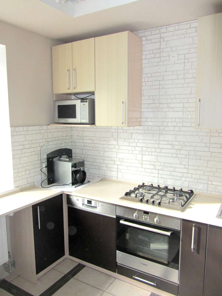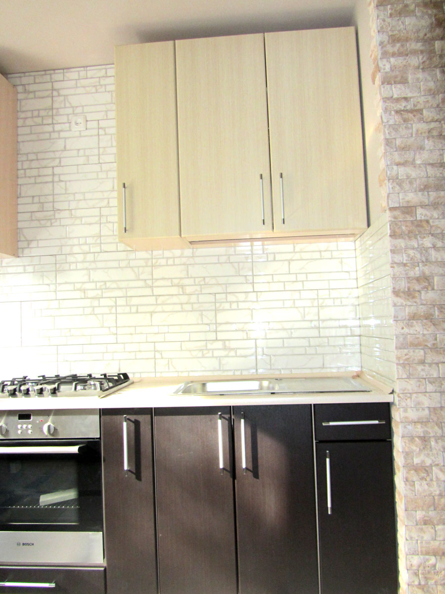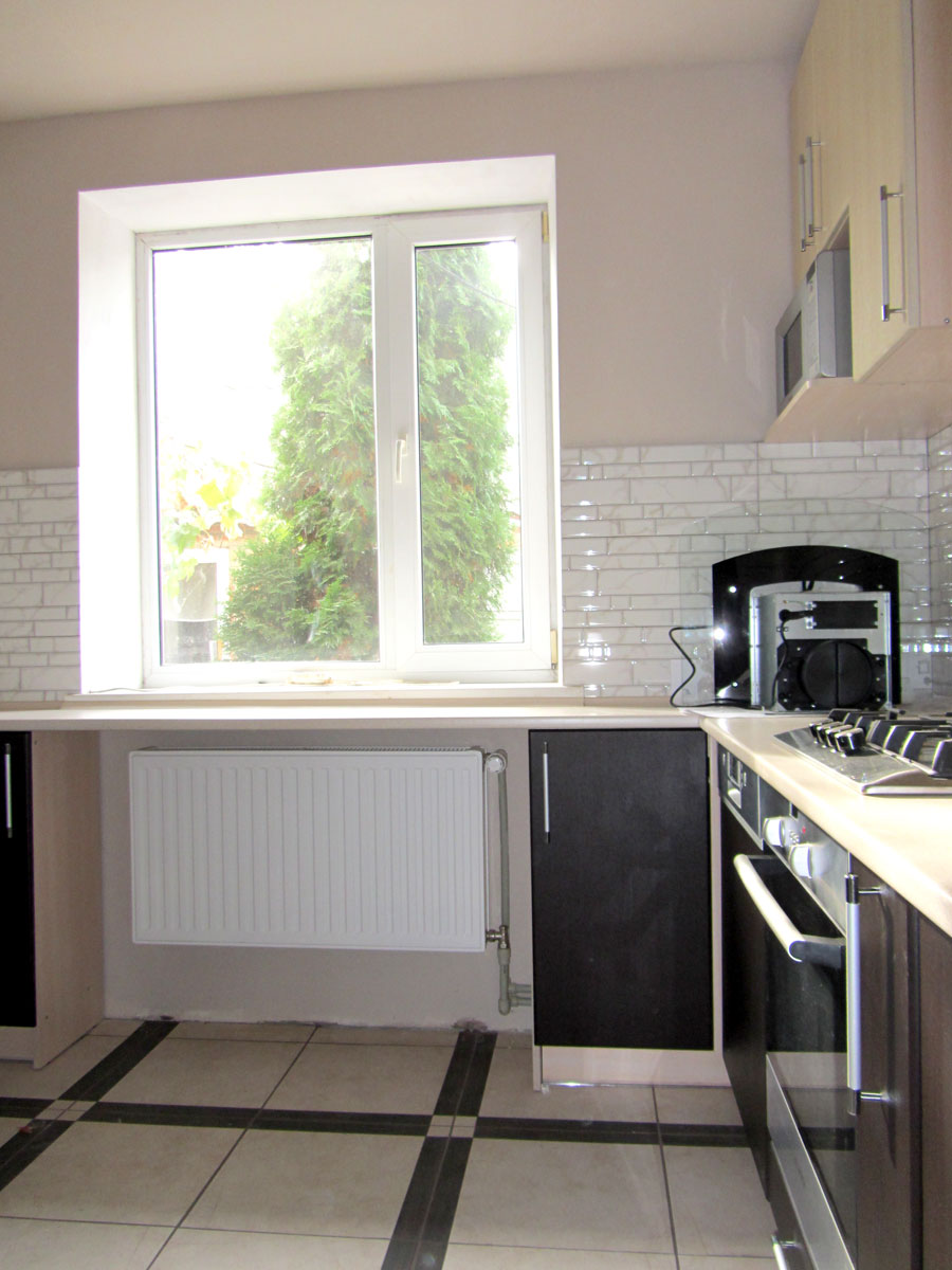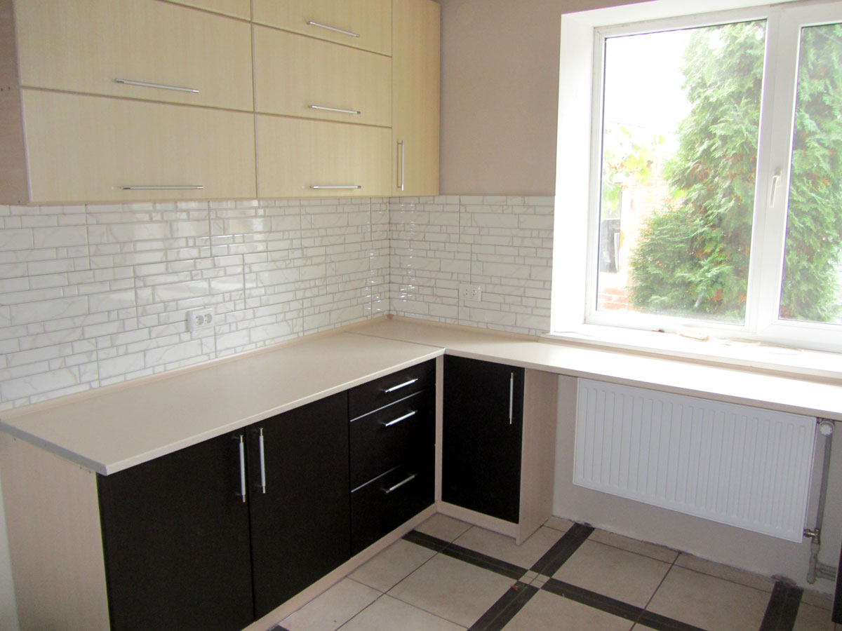 Кухня П-образная, расположена в частном секторе. Размер по 1й стене - 1,6 м,, по 2й стене - 2,4 м,