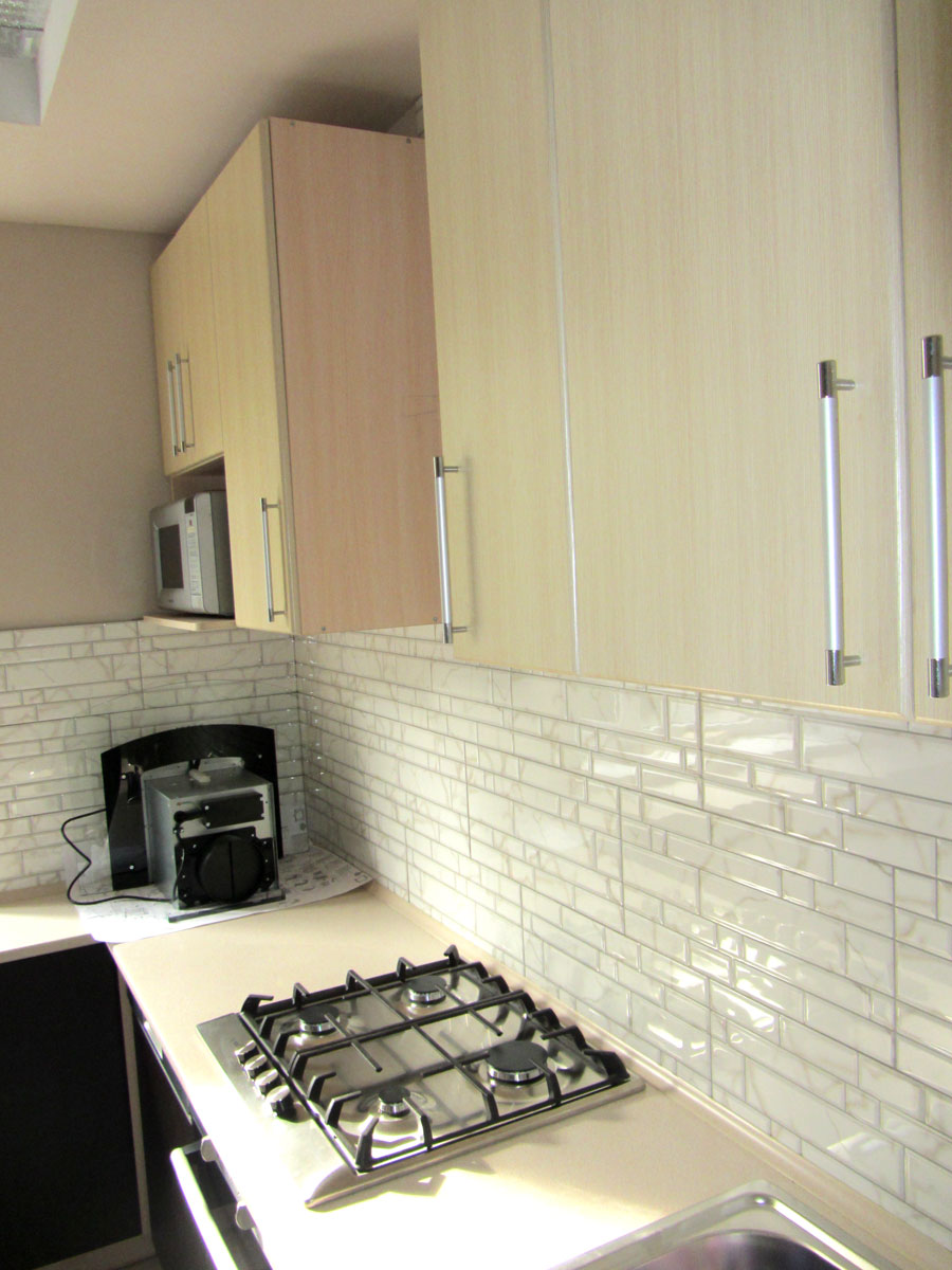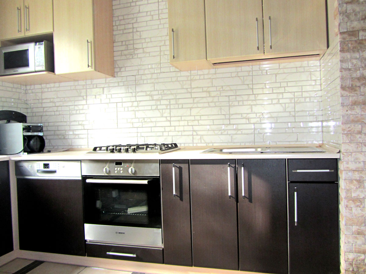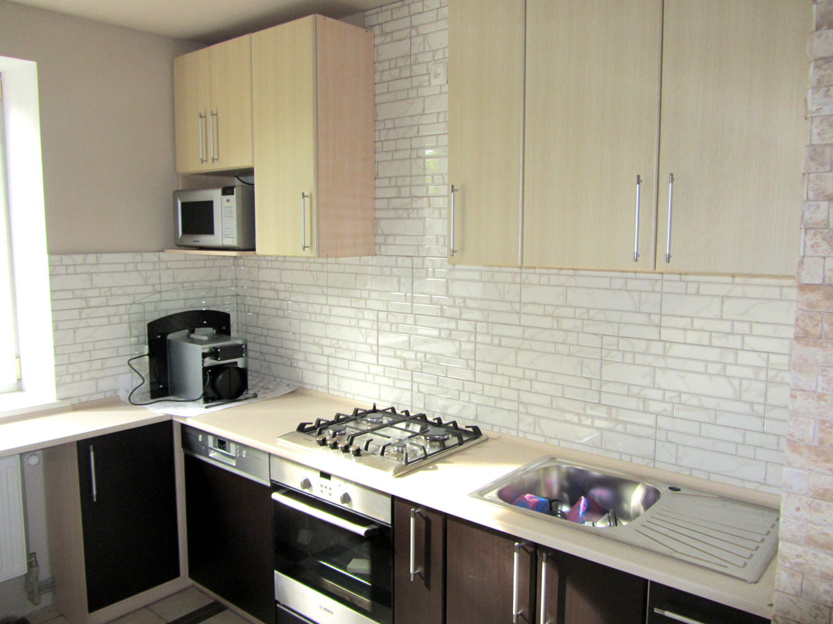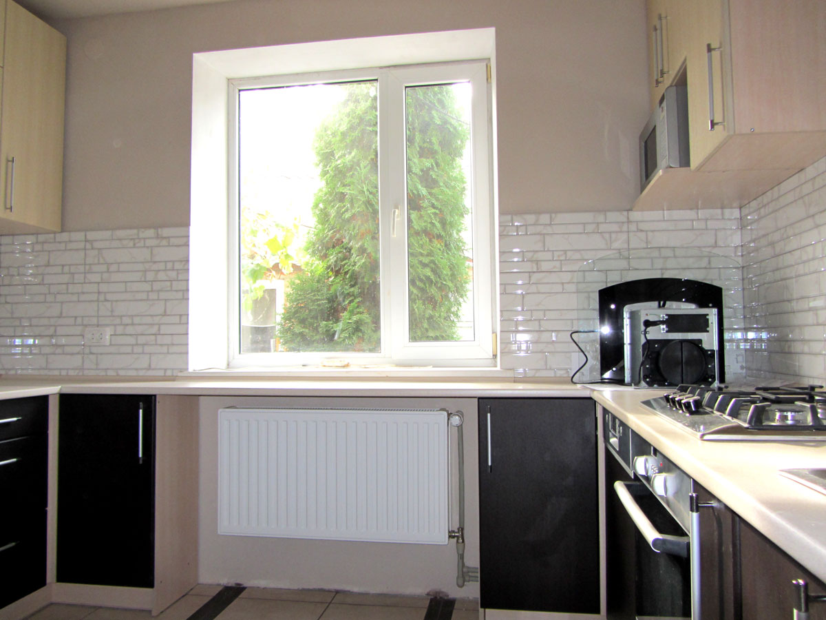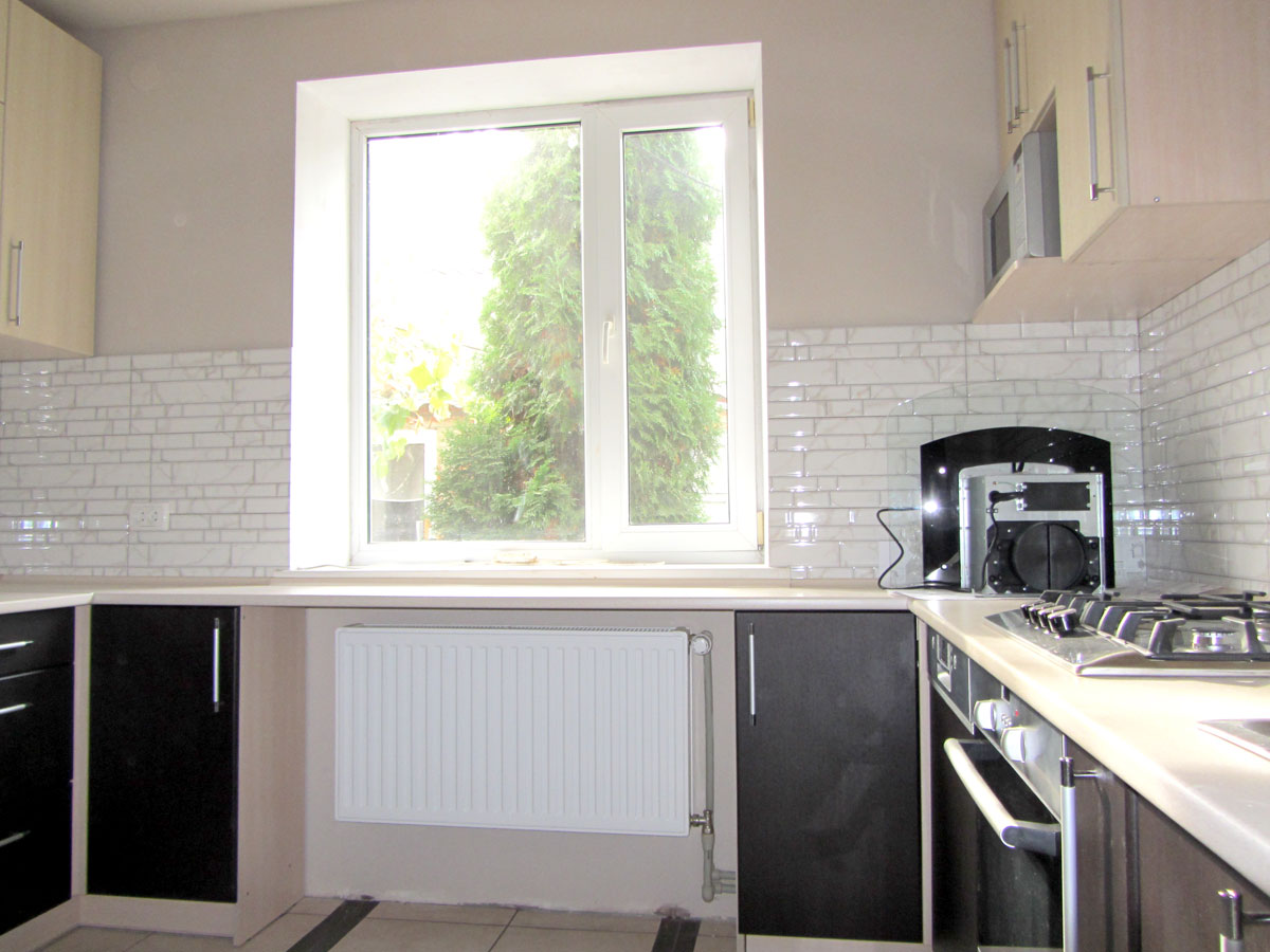 Кухня П-образная, расположена в частном секторе. Размер по 1й стене - 1,6 м,, по 2й стене - 2,4 м,