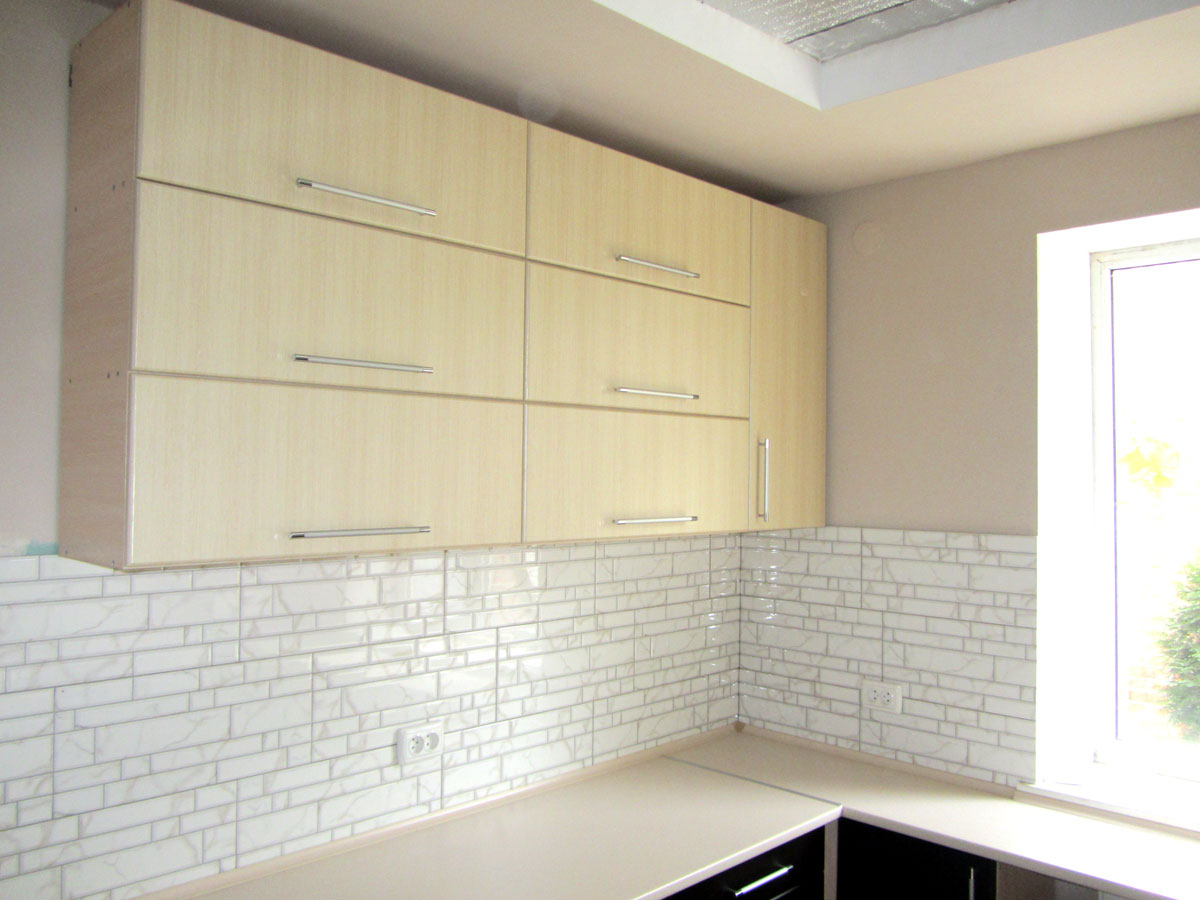 Высота столешницы - 850 мм, высота верхних шкафов - 900 мм.