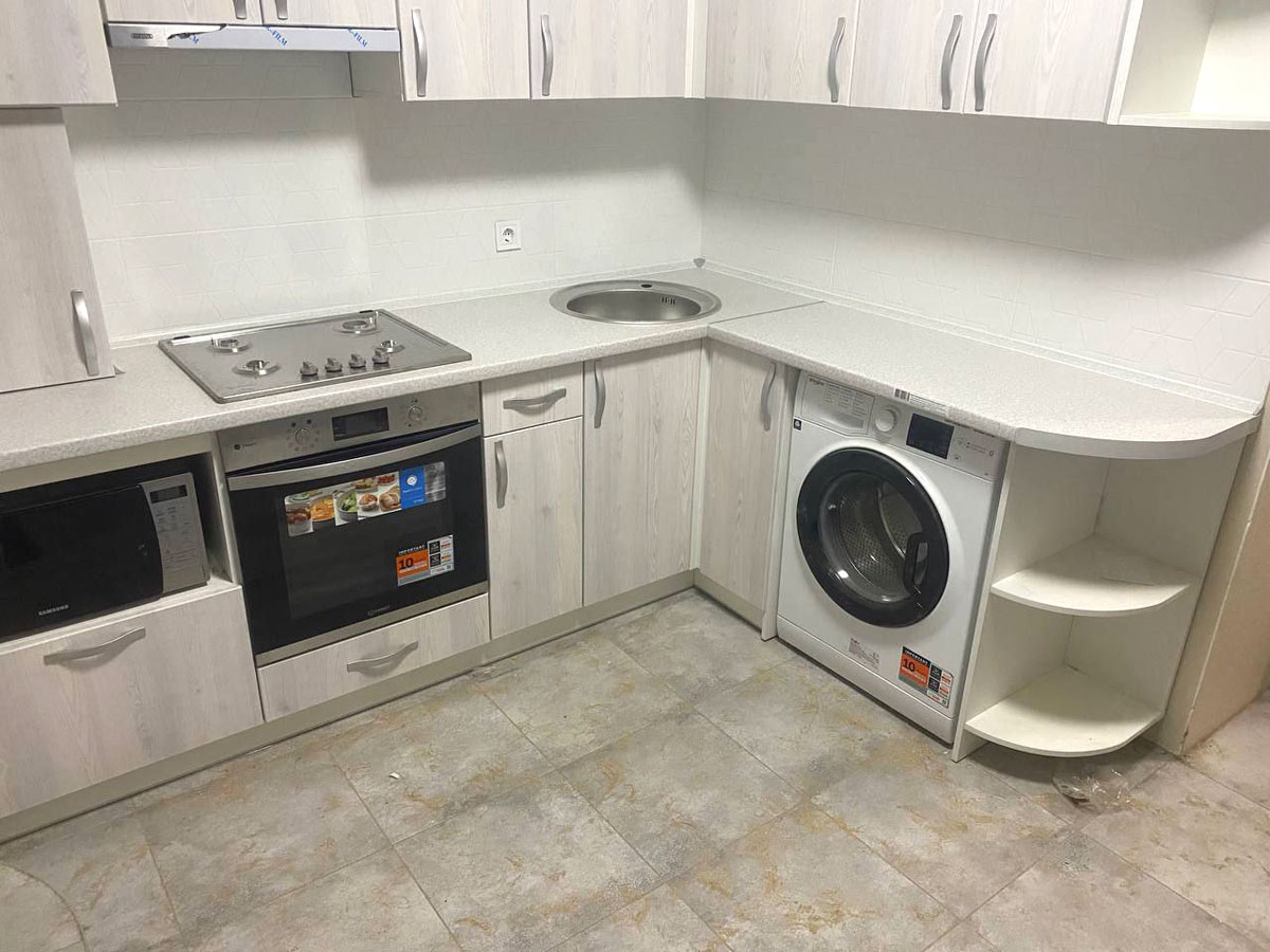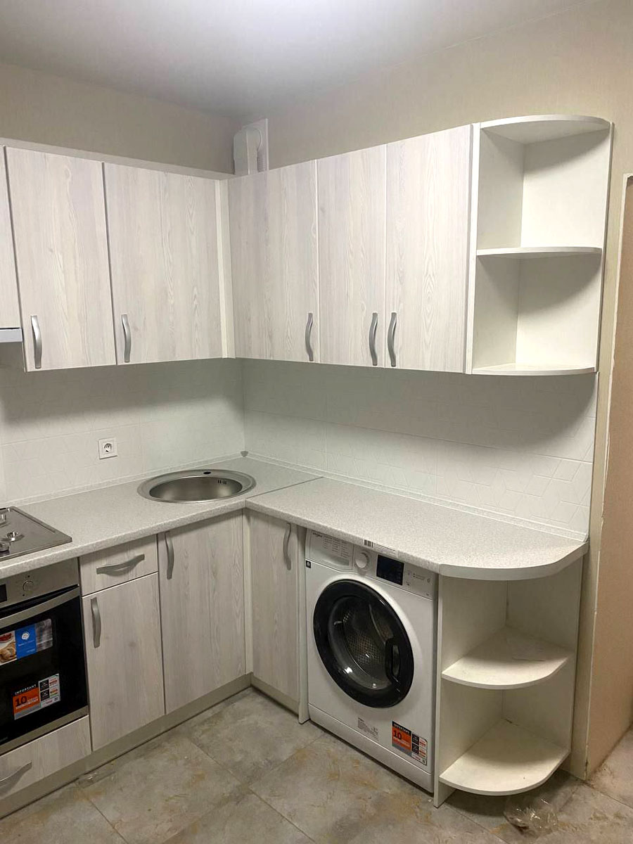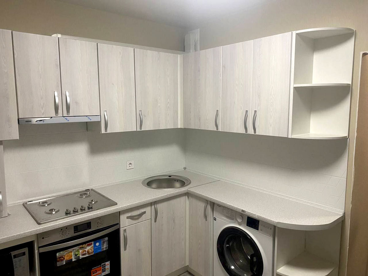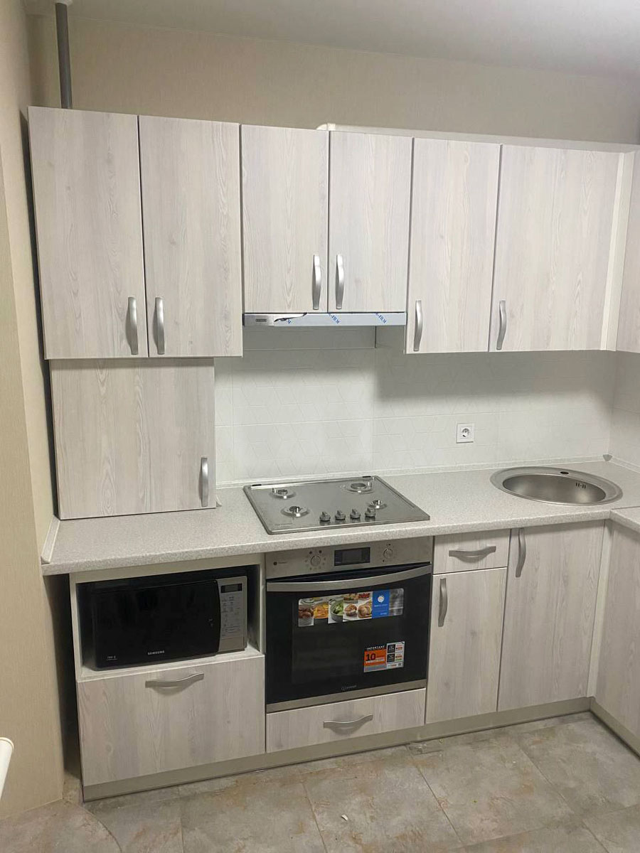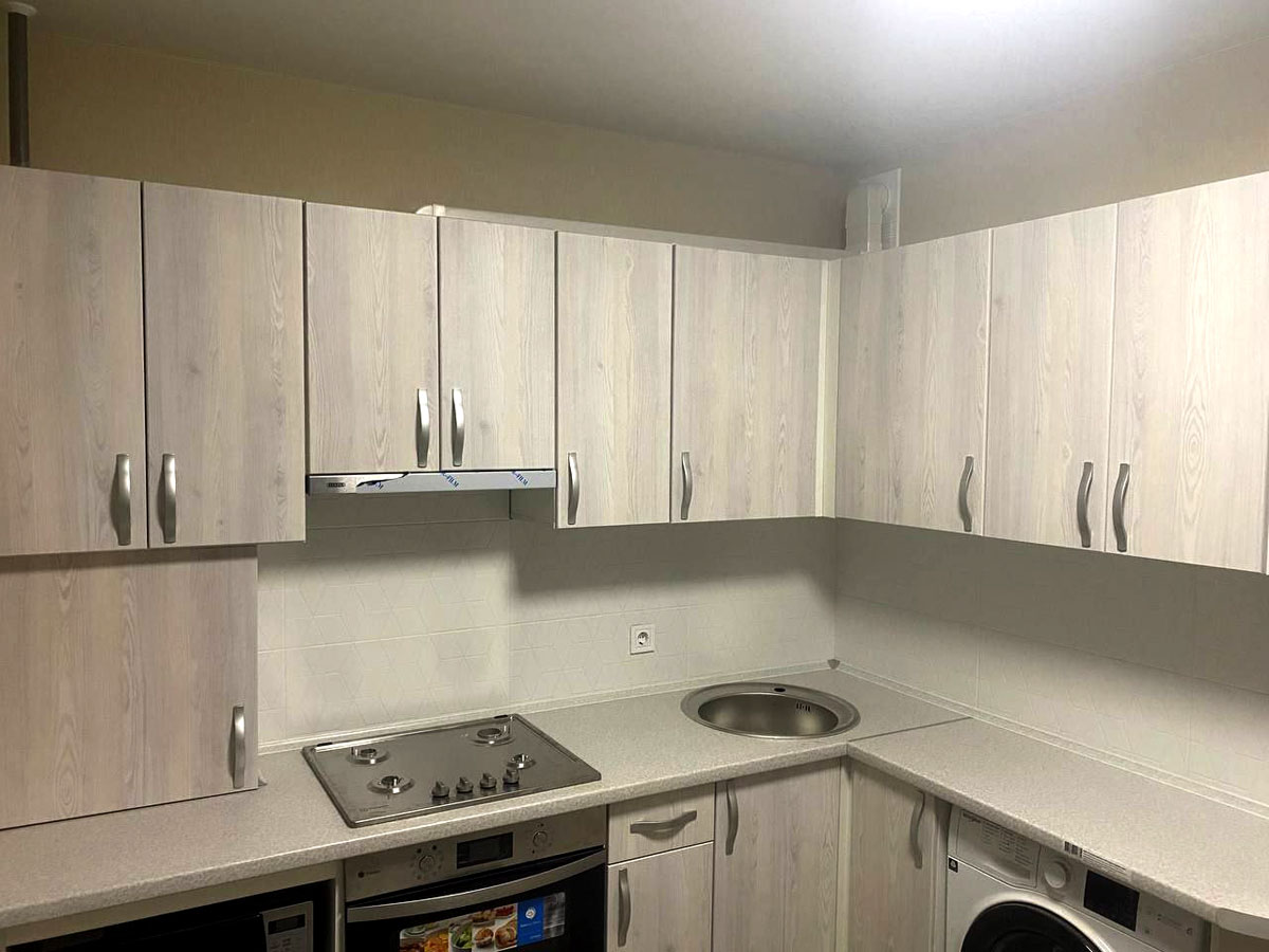 Кухня угловая, расположена в высотном доме. Высота столешницы - 890 мм, высота верхних шкафов - 720 мм.